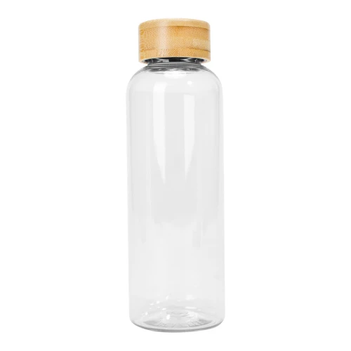 Botella plástica PET color translúcido, con tapa redonda twist-off de Bamboo, modelo "AINOA". Producto BPA FREE, para el contacto con líquidos y alimentos. Capacidad 550ml. Presentación en bolsa OPP + caja de regalo de cartón kraft.