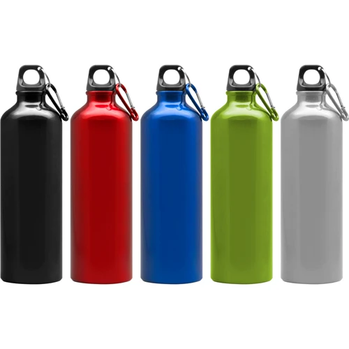 Ø 7,2 x 25,5 cm. Capacidad 750 ml. Aluminio. Botella de aluminio. Tapa a rosca plástica y gancho metálico.