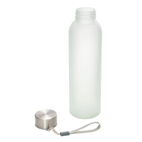 Durabilidad y diseño en un solo envase.Botella de vidrio con acabado frost sublimable. Tapa de acero inoxidable, anillo de silicona antiderrame y correa reforzada. Medidas: Ø 6,2 x 22 cm.