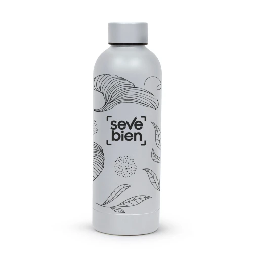 Ø 7.4 x 22 cm. Capacidad 500 ml. Acero inoxidable. Botella doble pared, sellada al vacío. Interior en acero 304 y exterior en acero 201. Mantiene hasta 12 hs la temperatura de las bebidas calientes y hasta 24 hs la de las bebidas frías. Presentación en caja de regalo.