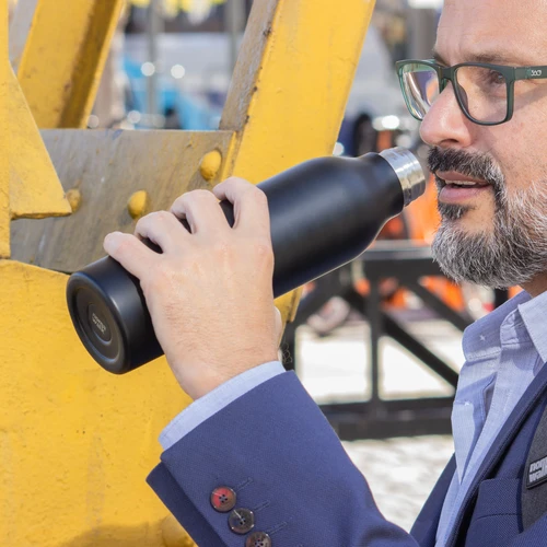 Ø 6,6 x 24,5 cm. Capacidad 500 ml. Acero inoxidable. Botella doble pared, sellada al vacío con recubrimiento de cobre. Interior de acero 304 y exterior de acero 201. Pintura color negro mate. Tapa de acero a rosca. Mantiene por más de 12 hs la temperatura de las bebidas calientes y hasta 24 hs la de las bebidas frías. Presentación en caja de regalo.