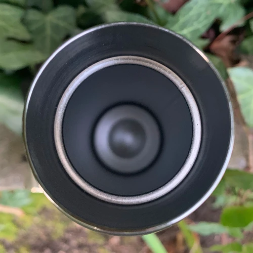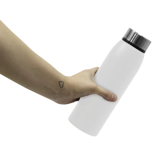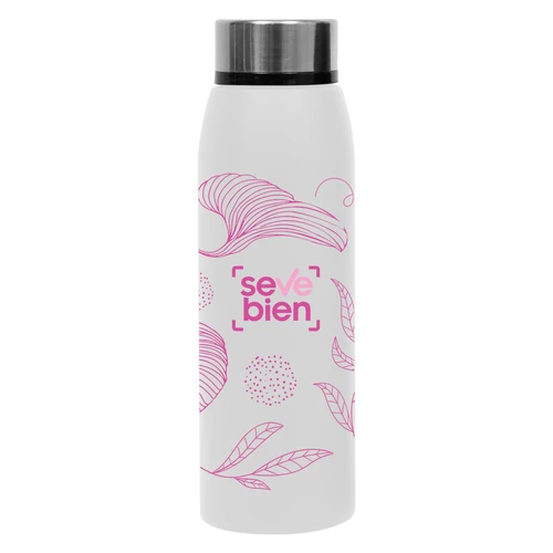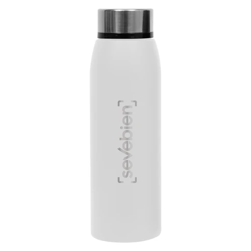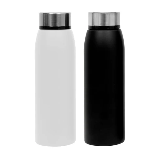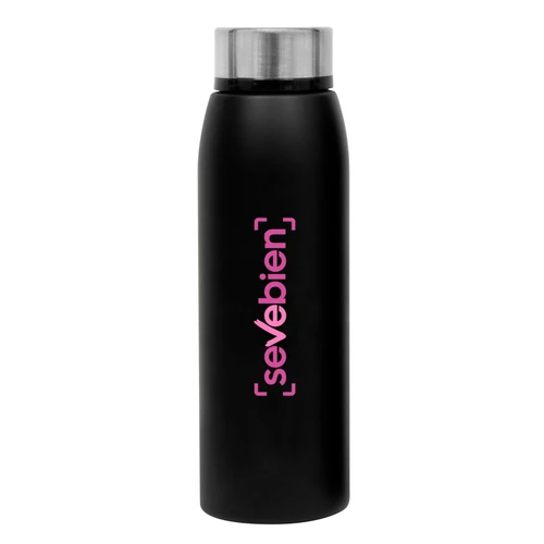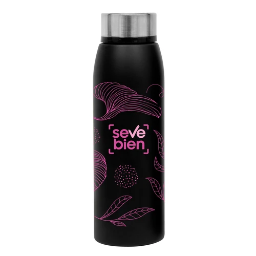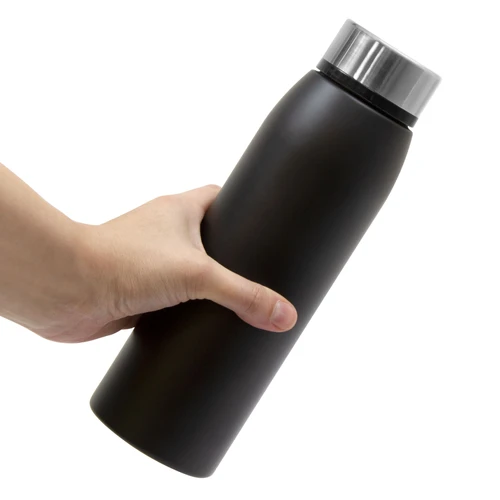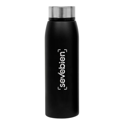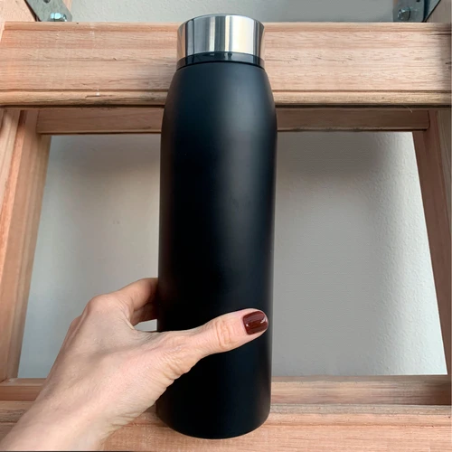 Ø 7 x 23,5 cm. Capacidad 500 ml. Botella doble pared, sellada al vacío. Interior de acero 304 y exterior de acero 201. Cuerpo color negro y tapa a rosca de acero. Mantiene hasta 12 hs la temperatura de las bebidas calientes y hasta 24 hs la de las bebidas frías. Presentación en caja de regalo.