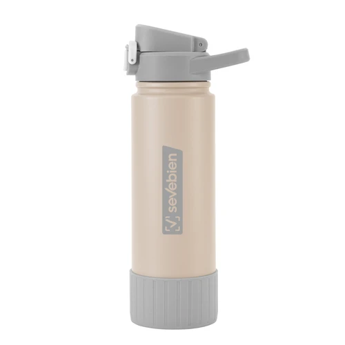 Hidratación que acompaña tu ritmo.Botella deportiva con doble pared, sellada al vacío. Interior de acero 304 y exterior de acero 201. Pintura powder coat (pintura más duradera y resistente a la corrosión y el paso del tiempo). Tapa plástica a rosca con anillo de silicona combinada con tapa rebatible a presión y traba de seguridad antiderrame. Asa flexible y resistente de TPE. Boquilla con bombilla incluida. Base con grip de silicona del mismo color de la tapa. Mantiene hasta 12 hs la temperatura de las bebidas calientes y hasta 24 hs de las bebidas frías. Medidas: Ø 7,5 cm x 26,5 cm. y ancho de tapa 11 cm.