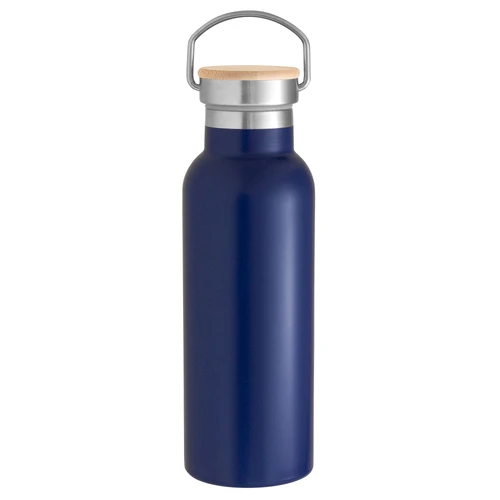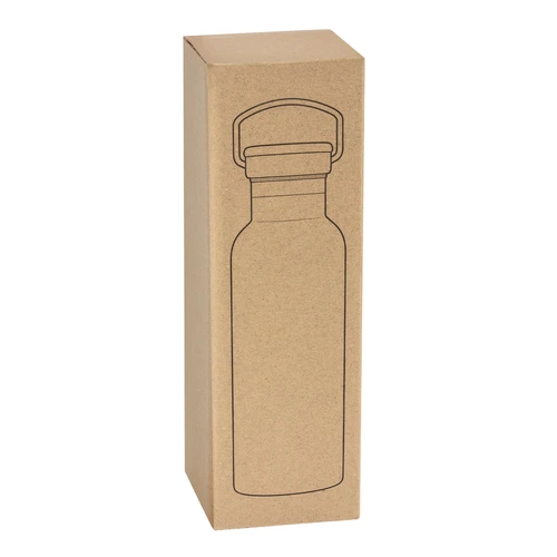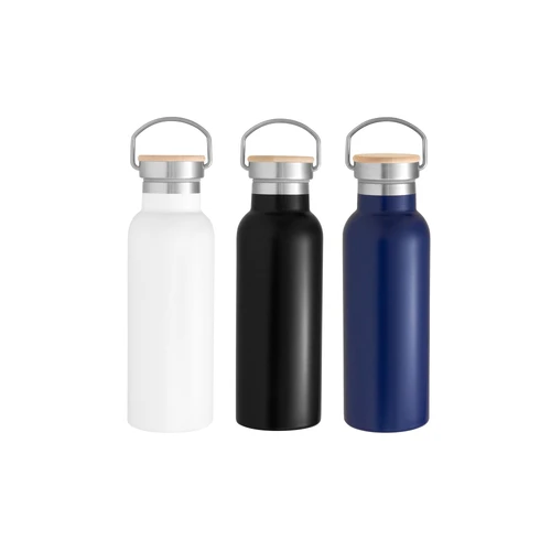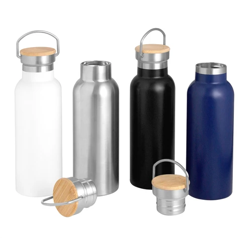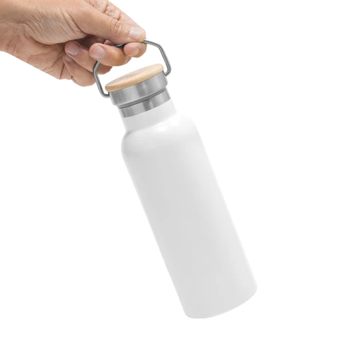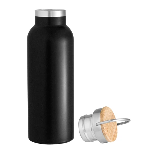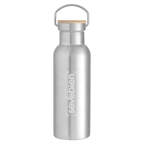 Ø 7,2 x 22,3 cm. Capacidad 550 ml. Acero inoxidable. Botella térmica doble pared sellada al vacío. Interior en acero 304 y exterior en acero 201. Tapa de acero inoxidable con manija metálica rebatible y detalles en bambú. Anillo de silicona antiderrame. Mantiene hasta 6 hs la temperatura de las bebidas calientes y hasta 10 hs la de las bebidas frías. Presentación en caja de regalo Kraft.