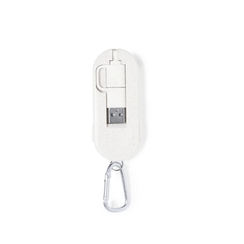Cable cargador con mosquetón fabricado en fibra de trigo y bambú. Con conexiones de entrada Tipo C y USB y salidas Tipo C, lightning y Micro USB. 5V DC 2A. Presentado en bolsa individual de diseño kraft.Elaborado con elementos vegetales para así fomentar la utilización de materias primas naturales y reducir las emisiones contaminantes.