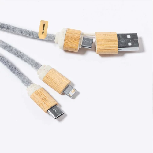 Cable cargador fabricado en bambú y fieltro RPET. Con conexiones de entrada Tipo C y USB y salidas Tipo C, lightning y Micro USB. 5V DC 2.4A. Presentado en bolsa individual de diseño kraft con autocierre, con distintivo en etiqueta.El fieltro RPET reciclado es fruto de la combinación del proceso de reciclaje de materiales plásticos junto a la técnica milenaria de fabricación del fieltro, dando como resultado un material de eco-tendencia que, además de ser de origen reciclado, también se convierte en reciclable.