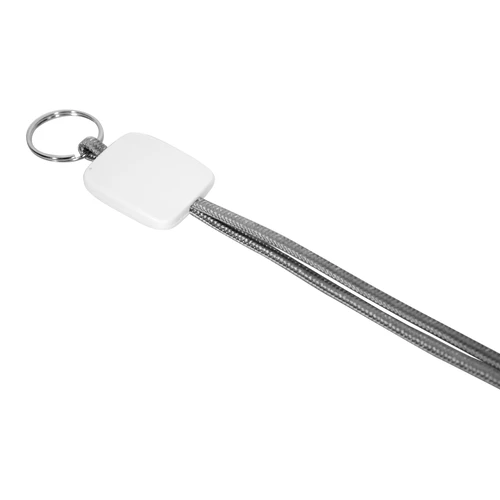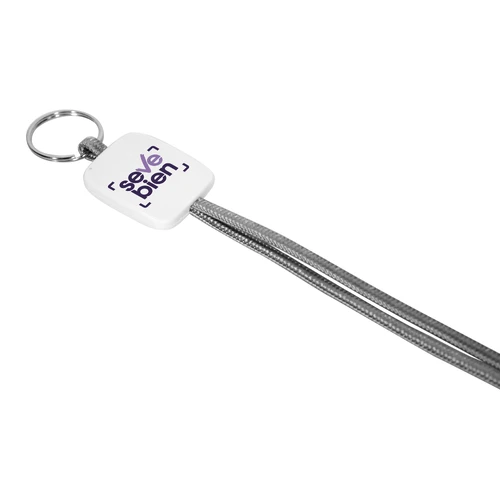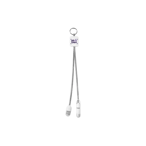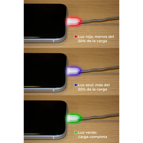26,5 (medida total del cable con los adaptadores). 3 x 3,5 x 0,4 (medidas del cuadrado plástico donde se aplica el logo). Anillo para enganche o colocar llaves. Cargador tipo C y Iphone. Luz indicadora de carga del celular, cuando el color es rojo la batería del celular posee una carga menor al 50%, azul del 51 al 99% y verde cuando está totalmente cargada.