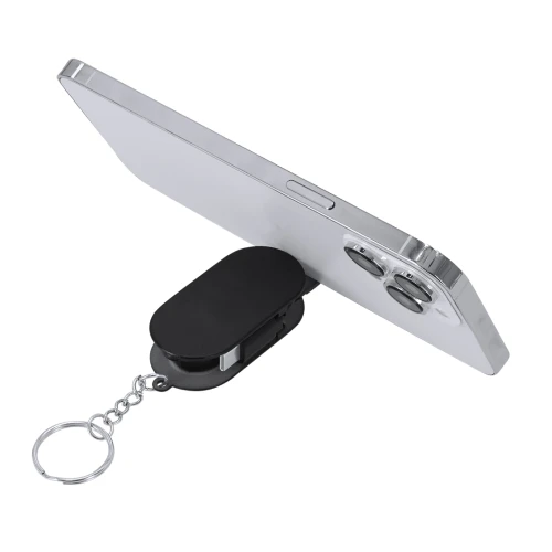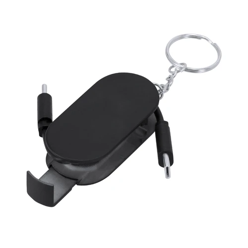 Cable Cargador llavero en ABS. Con soporte retráctil en la base para smartphone. Incluye dos entradas de tipo C para función de carga con potencia máxima 60W.