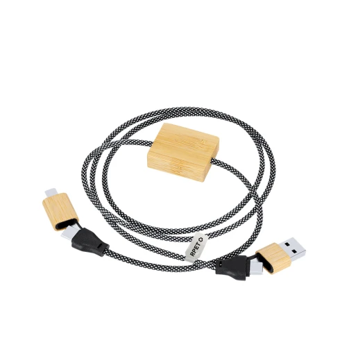 Cable cargador de 60 W en una combinación de RPET y bambú. Con conexiones de entrada Tipo C y USB y conexiones de salida Lightning, Micro USB y Tipo C. Potencia de carga: Hasta 60W, asegurando una carga rápida y eficiente.