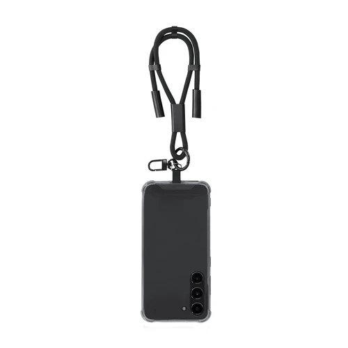 Pulsera con función de soporte y cable cargador, fabricado en una combinación de poliéster RPET. Diseñado para colocarse fácilmente entre la funda y el smartphone gracias a su accesorio de transporte. Incluye cinta a juego, mosquetón metálico giratorio en color negro y accesorio para ajuste en muñeca. Ofrece funcionalidad de carga y traspaso de datos, con entrada Tipo C 60W, y salidas Tipo C.