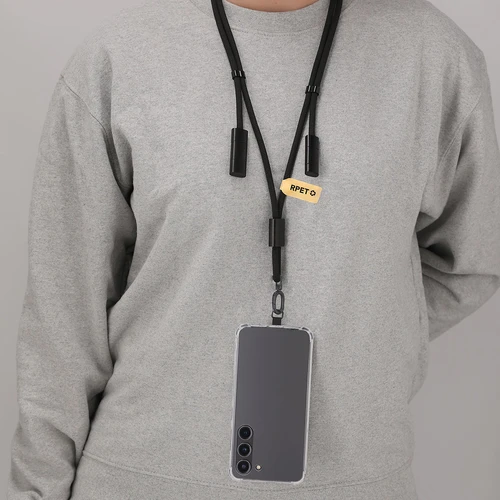 Innovador lanyard con función de soporte y cable cargador, fabricado en una combinación de poliéster RPET y aluminio reciclado. Diseñado para colocarse fácilmente entre la funda y el smartphone gracias a su accesorio de transporte. Incluye cinta a juego, mosquetón metálico giratorio en color negro y accesorio de seguridad para el cuello. Ofrece funcionalidad de carga y traspaso de datos, con entrada USB y Tipo C, y salidas Micro USB, Lightning y Tipo C. Presenta un distintivo de RPET en etiqueta kraft, destacando su compromiso sostenible.El material RPET se elabora a partir de plástico reciclado, para así fomentar la reutilización de residuos plásticos y ayudar a la sostenibilidad del planeta.El Aluminio Reciclado es un material con posibilidades de reciclaje casi infinitas, sin perder sus propiedades originales y consumiendo menos energía en este proceso.Certificación GRS (Global Recycled Standard / Estándar de Reciclaje Global), que garantiza el origen reciclado del material usado para fabricar el producto.