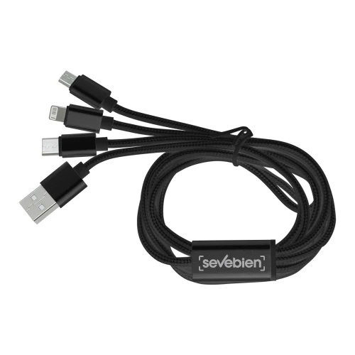 120 cm. Aluminio y Nylon. Cable con entrada USB y diferentes adaptadores: Iphone, Type C y Android. Viene dentro de una bolsa plásticas con cierre ziploc.