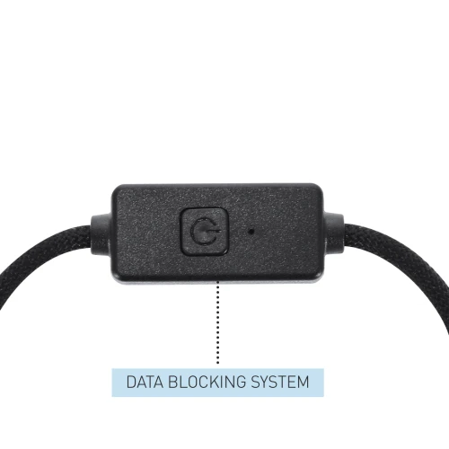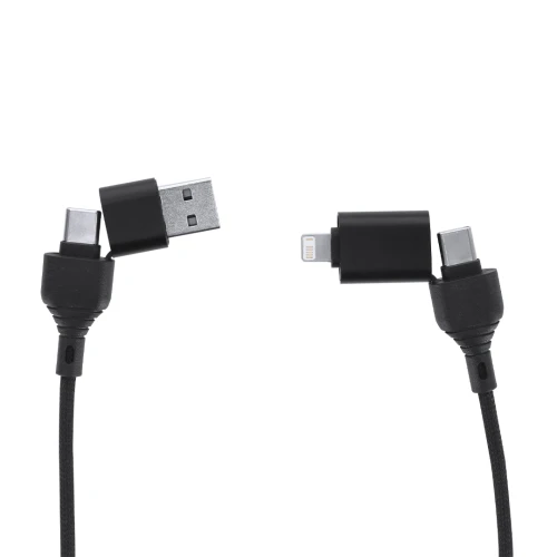 Cable de carga de 60W y transferencia de datos, con sistema de protección de datos. Fabricado en aluminio reciclado en combinación con RPET y ABS reciclado. Incluye botón de seguridad integrado que permite desactivar la función de transferencia de datos, una solución práctica para proteger la información personal y confidencial cuando el cable se utiliza en espacios públicos, evitando accesos no autorizados o intentos de hackeo. Conexiones de entrada Tipo C y USB y de salida Tipo C y Lightling. El Aluminio Reciclado es un material con posibilidades de reciclaje casi infinitas, sin perder sus propiedades originales y consumiendo menos energía en este proceso. El material RPET se elabora a partir de plástico reciclado, para así fomentar la reutilización de residuos plásticos y ayudar a la sostenibilidad del planeta.