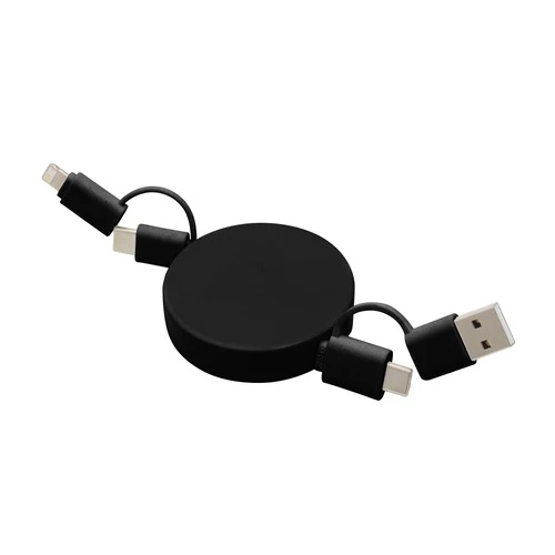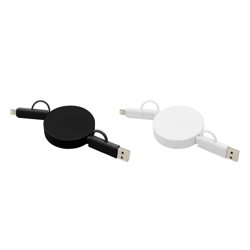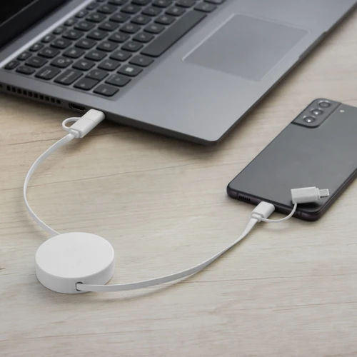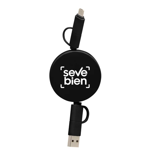 Llévalo a donde vayas.Cable de carga retráctil con longitud de hasta 90 cm. Carga y transferencia de datos de alta velocidad. Carga rápida de 65W. Entrada 2 en 1: USB y USB-C. Salida: 2 en 1: Lightning y USB-C. Diseño con acabado mateMedidas: Ø 5,3 x 1,3 cm.