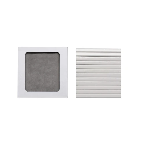 Cajas de12 lápices de madera acabado blanco, con cuerpo hexagonal y minas en varios colores. Presentados en estuche de cartón con cierre de solapa. Diseñado especialmente para grabado digital.