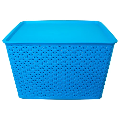 Canasto plástico organizador de 36.5 x 30 x 22 cm con tapa plástica. Diseño entrelazado tipo ratán. Capacidad 24 lt.