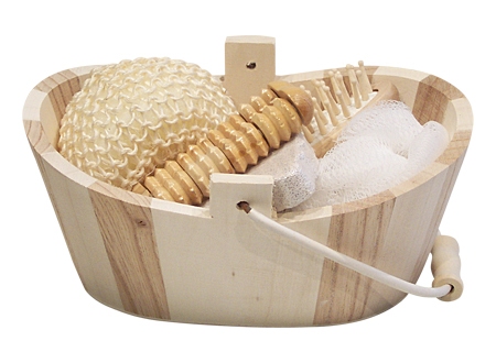 Canasto SPA de belleza en madera modelo "Naturals". Contiene cepillo de pelo, esponja malla, masajeador de madera, piedra pomez y esponja de masaje corporal.
