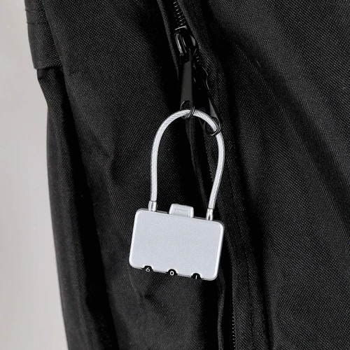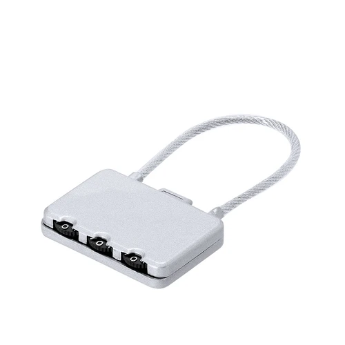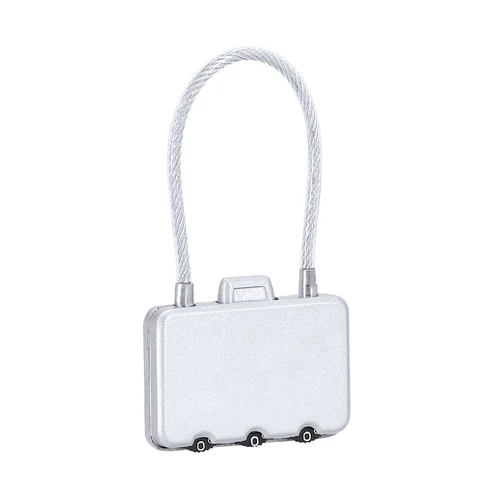Candado con contraseña numérica metálico de 3 dígitos, botón de apertura en la parte superior y cierre de cable de acero.