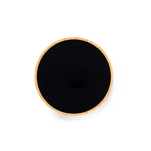 Cargador inalámbrico circular. Fabricado en bambú, con superficie en elegante color negro. Luz led interior y recubrimiento exterior especialmente diseñado para marcaje en láser, iluminando así el logotipo. Con función carga de 15W, compatible con dispositivos equipados con tecnología de carga inalámbrica Qi. Con base antideslizante, incluye cable cargador Tipo C y manual de instrucciones en español e inglés. Presentado en caja individual de diseño kraft.