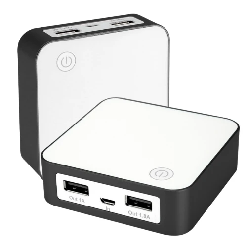 Power Bank cargador USB de plástico ABS con borde metálico. Capacidad 8400mAh. Incluye cable USB + 3 adaptadores para Conector Lightning, USB tipo C, Micro-USB, etc. Batería recargable incorporada. Presentación en caja blanca de regalo.