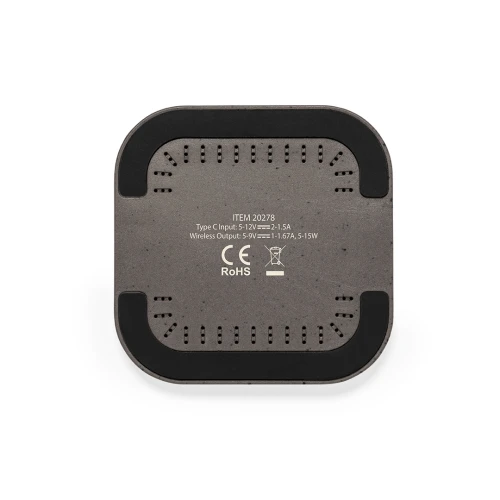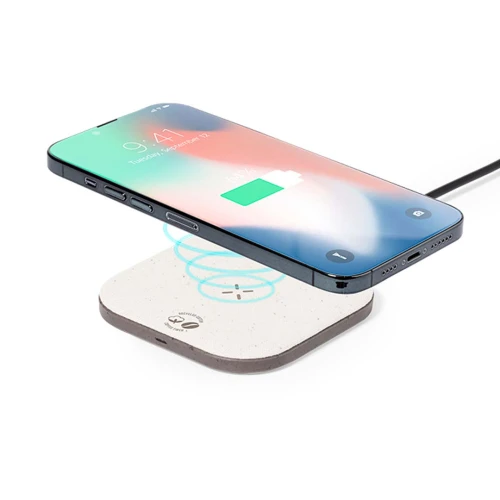 Cargador inalámbrico fabricado en fibra de café y algodón reciclado. Base antideslizante y compatible con dispositivos equipados con tecnología de carga Qi. Capacidad de carga de 15W, con cable negro Tipo C incluido. Con distintivos de fibra de café y algodón reciclado. Presentado en atractiva caja de diseño kraft, con manual de instrucciones en español e inglés.La fibra de café es una solución circular que se obtiene de la utilización de los residuos producidos en la obtención del café. Una alternativa sostenible que favorece la reducción del uso de plásticos, ahorrando energía en su proceso de fabricación y contribuyendo al cuidado del medio ambiente.Disponible certificación GRS (Global Recycled Standard / Estándar de Reciclaje Global), que garantiza el origen reciclado del material usado para fabricar el producto.