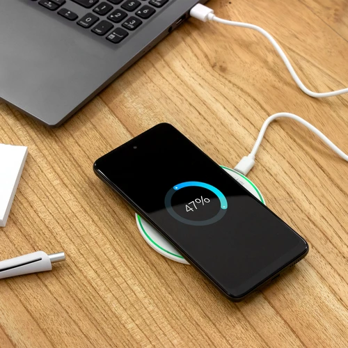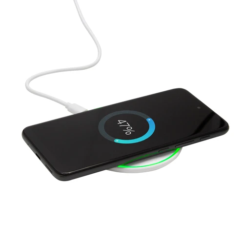 Mantente siempre conectadoCargador inalámbrico con luz. Base plástica color blanco con antideslizantes. CARGA RÁPIDA. Salida: 15 watts. Luces indicadoras de carga. Cable de carga USB-C en color blanco de 50 cm de largo. Compatible exclusivamente con celulares que permitan carga inalámbrica (tecnología qi). Medidas: Ø 9,7 x 0,9 cm.