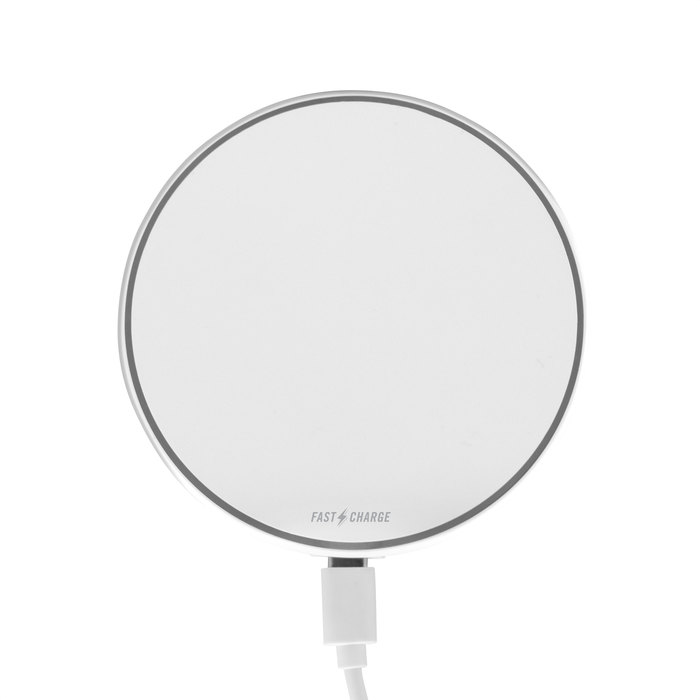 Ø 9,7 x 0,9 cm. Plástico ABS. Cargador inalámbrico con luz. Base plástica color blanco con antideslizantes. CARGA RÁPIDA. Salida: 15 watts. Luces indicadoras de carga. Cable de carga USB-C en color blanco de 50 cm de largo. Presentación en caja de regalo kraft.