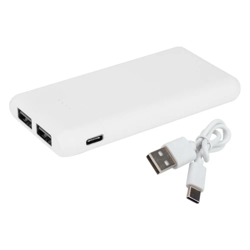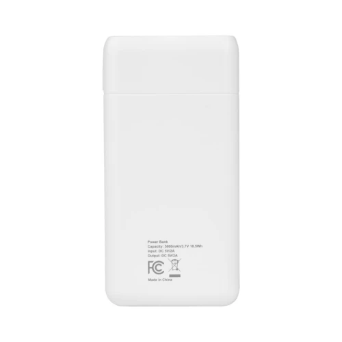 Cargador Power Bank USB portátil plástico ABS blanco, con indicador de carga y doble salida USB. Capacidad 5000mAh. Entrada DC 5V/2A, salida DC 5V/2A. Incluye cable USB/Type C. Batería recargable incorporada. Presentación en caja de regalo de cartulina blanca con colgador para ganchera .