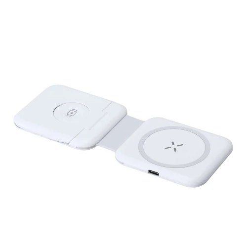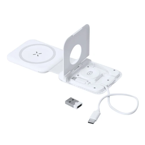 Completo multicargador inalámbrico 15W con soporte para gadgets 3 en 1 plegable. Diseñado para la carga simultánea del smartphone/auriculares y smartwatch: una estación de carga todo en uno. Incluye set de cables Tipo C y adaptador USB, aptos para la transferencia de datos.
