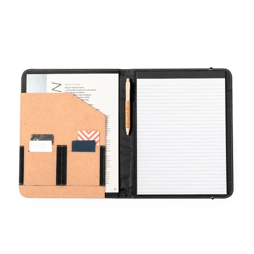 Elegante carpeta archivadora fabricada en corcho natural. Con bolsillo interior grande para folios, 4 portatarjetas, elástico para bolígrafo y bloc de 20 hojas con disposición a una raya. Cierre mediante una banda elástica en su exterior. Presentado individualmente en bolsa reciclada. Elaborado con elementos vegetales para así fomentar la utilización de materias primas naturales y reducir las emisiones contaminantes.