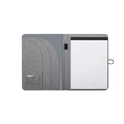 Elegante carpeta de línea nature tamaño A4. Fabricada en resistente 600D RPET efecto melange, elaborado a partir de plástico reciclado para así fomentar la reutilización de residuos plásticos y contribuir a la sostenibilidad del planeta. Detalles en negro y cierre metálico con cinta elástica especialmente diseñado para marcaje en láser. Interior con bloc extraíble de 20 hojas con disposición a una raya, 3 bolsillos de solapa, tarjeteros y soporte para bolígrafo. Distintivo RPET en esquina.