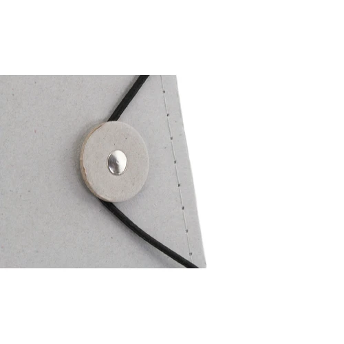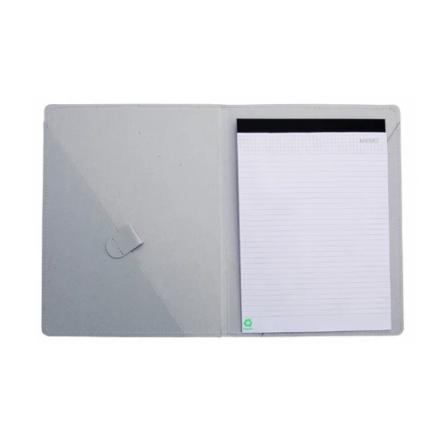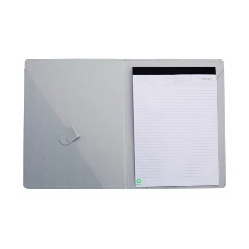 Carpeta con original cierre elástico en resistente cartón reciclado de acabado rígido con costuras de refuerzo. Interior con bloc extraíble de 20 hojas con distribución a una raya, bolsillo triangular de solapa y soporte para bolígrafo.