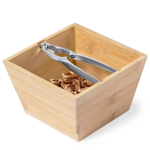Práctico set cascanueces. Contenido: Bowl fabricado en bambú natural, con 1,4 l de capacidad. Cascanueces de acero inoxidable, con diseño ergonómico que permite romper la cáscara de manera rápida y sencilla, manteniendo el fruto intacto. Presentación individual en caja de diseño kraft.