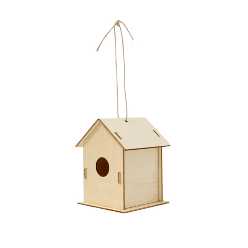 Caseta colgante para pájaros fabricada en madera natural. Incluye pincel y pinturas a base de agua en variados colores.