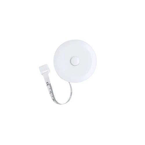 Cinta métrica de PVC de 150cm de largo y mecanismo retráctil con botón de parada. Escala impresa en color negro de cm y pulgadas.