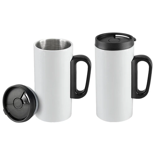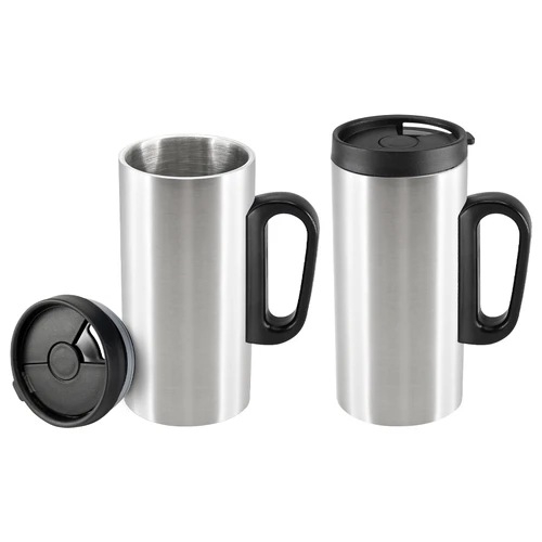 Mini-tazón para café modelo "Tritan" de Acero inoxidable doble pared aislante, cuerpo exterior color. Tapa de plástico PP negro con dosificador móvil.