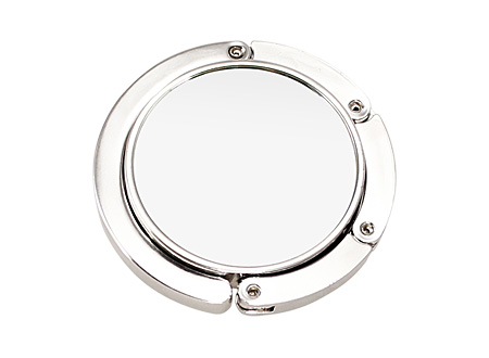 Colgador Metálico redondo de sobremesa, para Bolsos y Carteras, con círculo central para Sublimación. Presentación en estuche laminado negro con cuna aterciopelada.