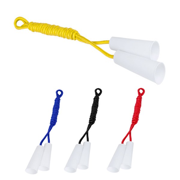 Comba con cuerda extra larga de 240cm de largo en vivos colores y con cómodos mangos de sujeción en color blanco. Presentación plegada.