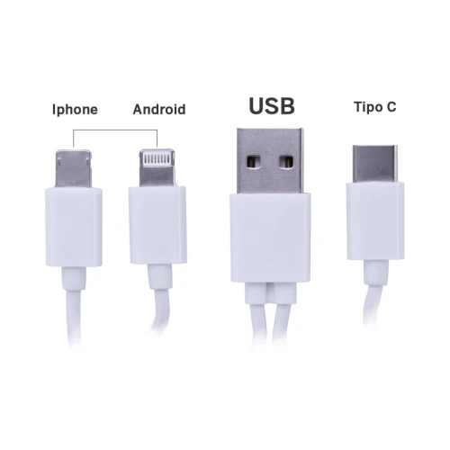 Connect Multicargador 4-en-1, en caja plástica redonda con tapa translúcida y soporte para celular, incluye terminal de carga USB y multicables Micro USB / i-phone / Type C. Incorpora nueva tecnología de cable cargador dual Micro USB y i-phone (en el mismo terminal). Compatible con dispositivos Android, Apple y Type C.