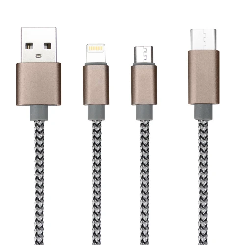 Deluxe Connect Multicargador 4-en-1 Metálico color Gris Titanio. Multi-cables con terminales de carga USB / Micro USB / Lightning / Type C. Compatible con dispositivos Android, Apple y Type C. Presentación en elegante bolsa OPP con orificio para colgador de ganchera. Producto con aprobación CE, ROHS, FC.