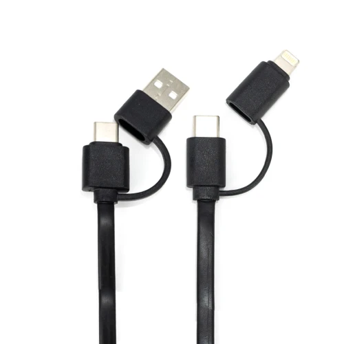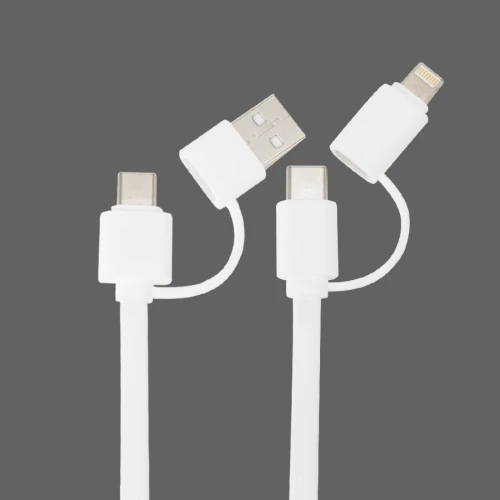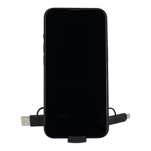 Connect Multicargador plástico ABS retráctil 4 en 1, con cubierta redonda de madera de bamboo. incluye 2 cables de plástico engomado TPE de color de 40cm c/u, con conector USB tipo (Micro-USB / Lightning / Type C) y conector de carga (USB / Type C). Presentación en bolsa 100% compostable + caja de regalo en cartón color natural.
