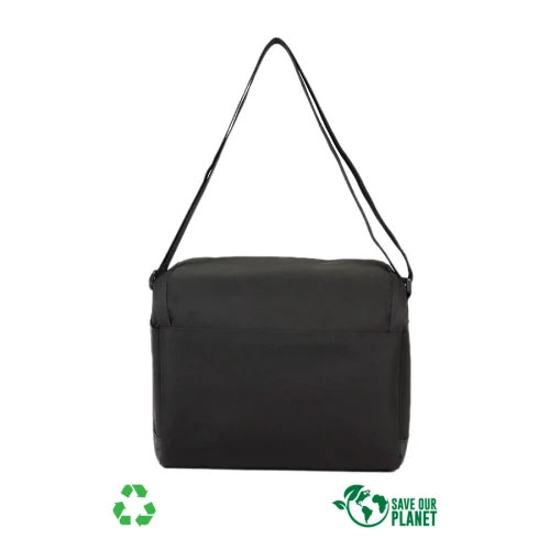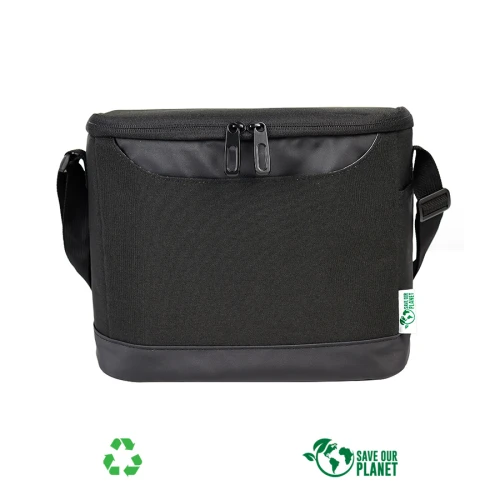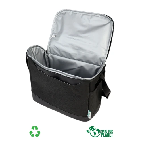 Bolso cooler modelo "Planet" de 7.5 litros de capacidad, fabricado en tela RPET, en base a pellets de botellas plásticas recicladas y poliéster 250D/PVC. Interior térmico aislante de PEVA y acolchado con esponja PE FOAM.
