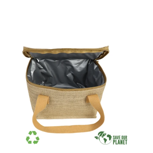 Bolso cooler con exterior de Yute e interior térmico aislante de PEVA y acolchado con esponja PE FOAM. En la tapa, sección superior del cooler, viene con una ventana cosida de eco-cuero, para aplicar logo de manera más elegante.
