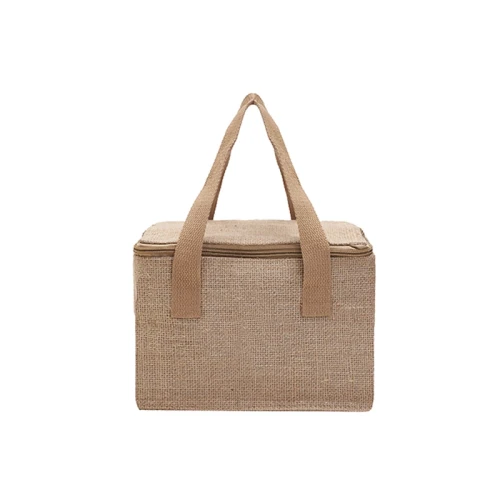 Cooler con exterior de Yute e interior térmico confeccionado en PEVA. Debido a la naturaleza rústica del material, el producto puede presentar imperfecciones.