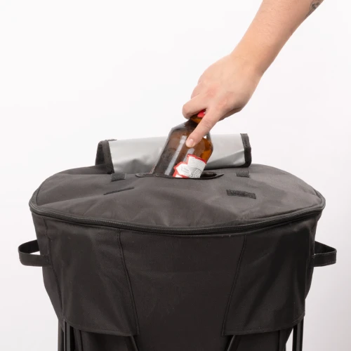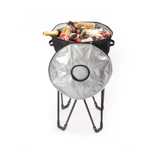 Bolso cooler grande de 50 litros de capacidad, en tela poliéster 600D/PVC. Interior térmico aislante de PEVA y acolchado con esponja PE FOAM. Cuenta con asas laterales para sujeción, cierre eclair 360°, ventana cuadrada con cierre velcro en la parte superior (tapa), para retiro ágil de productos y tapón de goma inferior para despiche de líquido acumulado dentro del cooler. Montado sobre estructura de patas metálicas plegables color negro, presentadas en bolsa de poliéster negro.