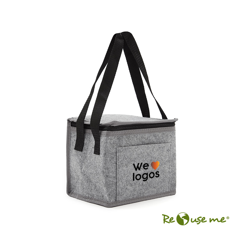 Cooler fabricado en fieltro de RPET, confeccionada a partir de botellas recicladas, con 2mm de espuma de polietileno laminado con película de aluminio. El producto se presenta en una bolsa de PLA 100% biodegradable. Ideal para transportar comida y bebida, conservando el frío. Dimensiones: 20,5 x 18 x 15 cm. Capacidad 5L. Reuseme.
