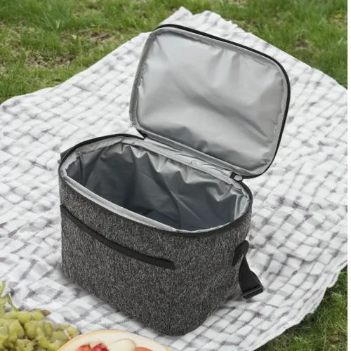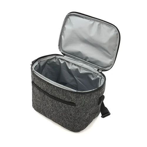 Cooler fabricado en tejido de punto como lienzo de nieve, con un revestimiento interior de espuma de polietileno y PEVA. Dimensiones: 22,5 x 18 x 16 cm. 6L