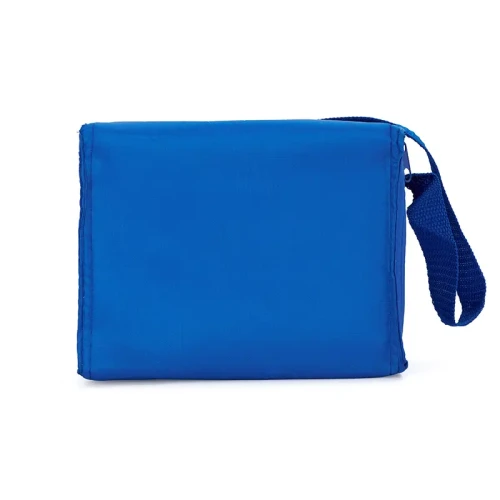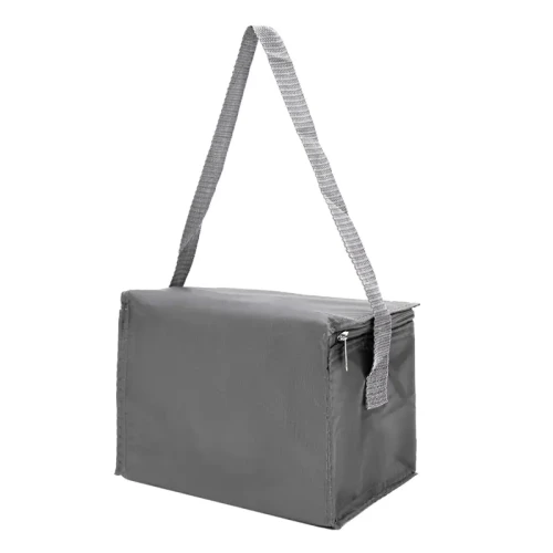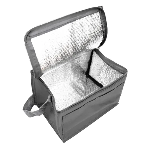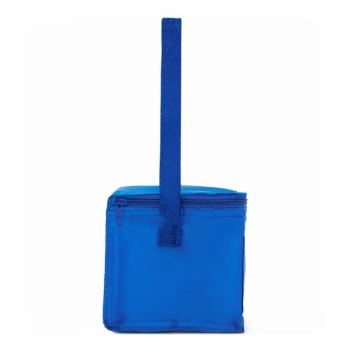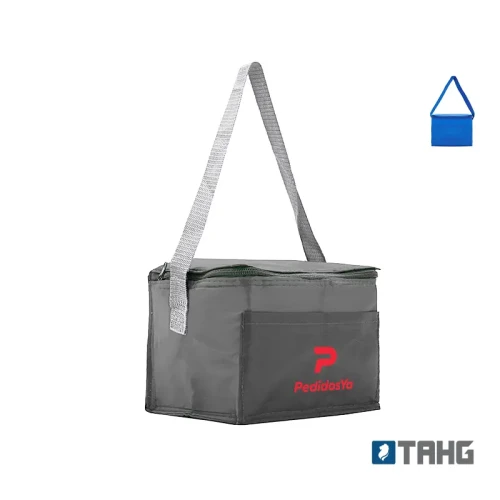 Realizado en su exterior en polyester 210T. Interior en aluminio y PE Foam 2mm. Tiras para hombro. Compartimiento principal superior. Bolsillo frontal. Medidas: 20,3 x 15,2 x 15,2 cm. Capacidad 5 Lt.