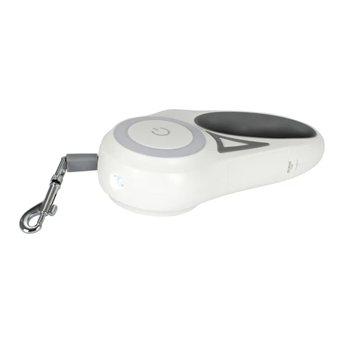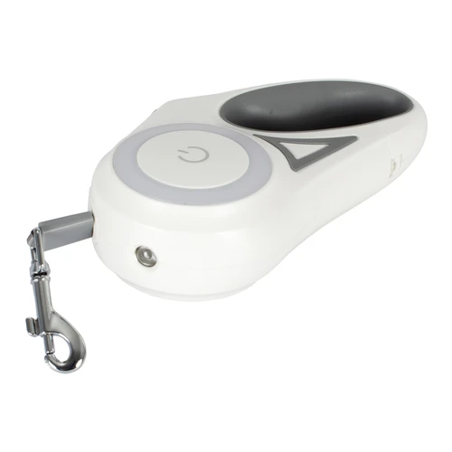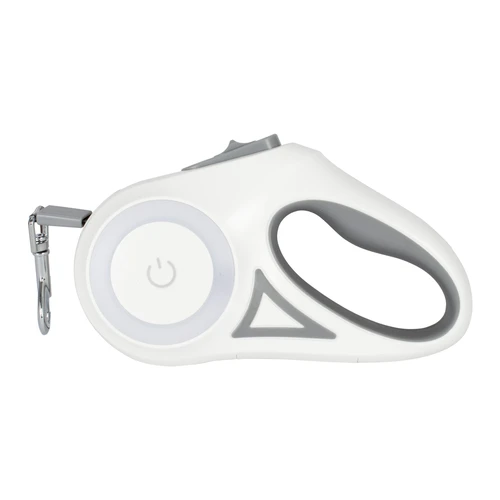 Correa extensible de 3mts para mascota, en plástico ABS blanco con detalles grises y correa de nylon color gris con sistema de traba. Contiene una linterna LED luz blanca + juego de luces LED de colores en círculo central. Usa 2 pilas AAA (no incluídas). Presentación en caja de cartón blanco de regalo.