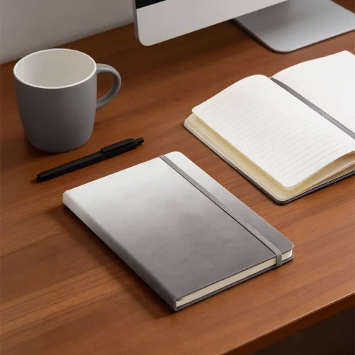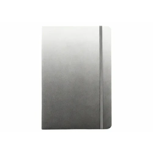 Cuaderno con tapa de efecto de color graduado. Cuenta con 80 hojas rayadas color marfil, de 70 gramos cada una. Posee una cinta separadora de color a tono y elástico para cerrarlo. Dimensiones: 21 x 14 x 1,4 cm (Altura x Longitud x Ancho).